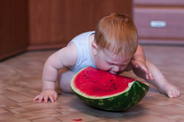 Постепенно перешли на еду мною приготовленную. Делаю пока в виде пюре. Разнообразия опять-таки не много: тыква, кабачок, говядина (отдал предпочтение именно этому виду мяса), творог, банан. Иногда яичный желток. Все таскает из тарелок. Чаще жует и выплевывает. Жует баранки и сушки - наше спасение от скандалов на улице. Ну и, разумеется, ГВ. Тот еще сисечник оказался.