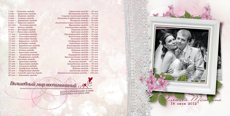 У друга нашей семьи была небольшая дата - 3 года. И он решила в подарок жене преподнести книгу с их свадебными фотографиями. Книга получилась большая - 30 разворотов. Но я, по сложившейся традиции, покажу лишь несколько. )))
