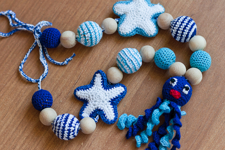 Захотелось мне связать что-нибудь сине-голубое, т.к. основа моего гардеробы - джинсы. И хотелось попробовать связать бусы с игрушками. А такая цветовая гамма у меня ассоциируется с морем. Так что вот такие мои вторые бусы: