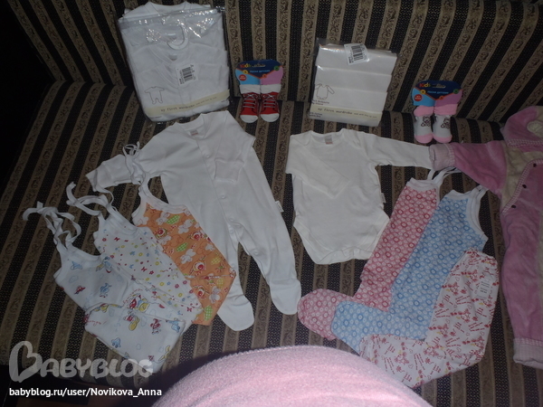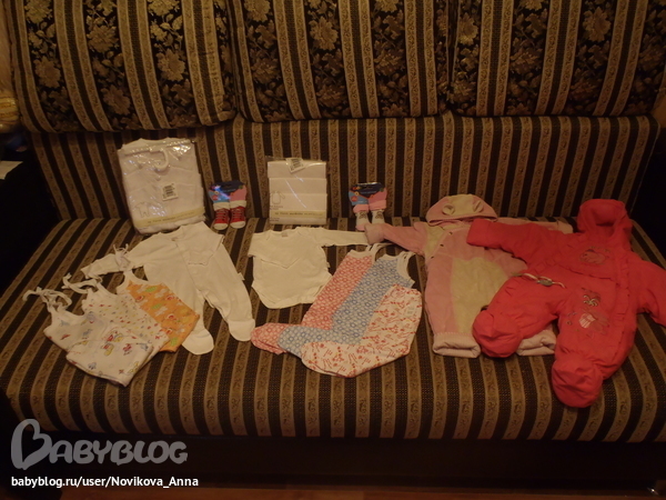 Слипик и бодик фирмы НЕКСТ. Качество очень понравилось. В упаковке по 5 штук. По леавую сторону от них ползунки утепленные как раз на первые 3 мес. По правую сторону тоненькие ползунки и штанишки. Много покупать не хочу т.к. еще многое будет подарено и передано от племянников. Закажу еще пару вещичек в нексте "на выход". И останется придумать что мы будем одевать на выписку.