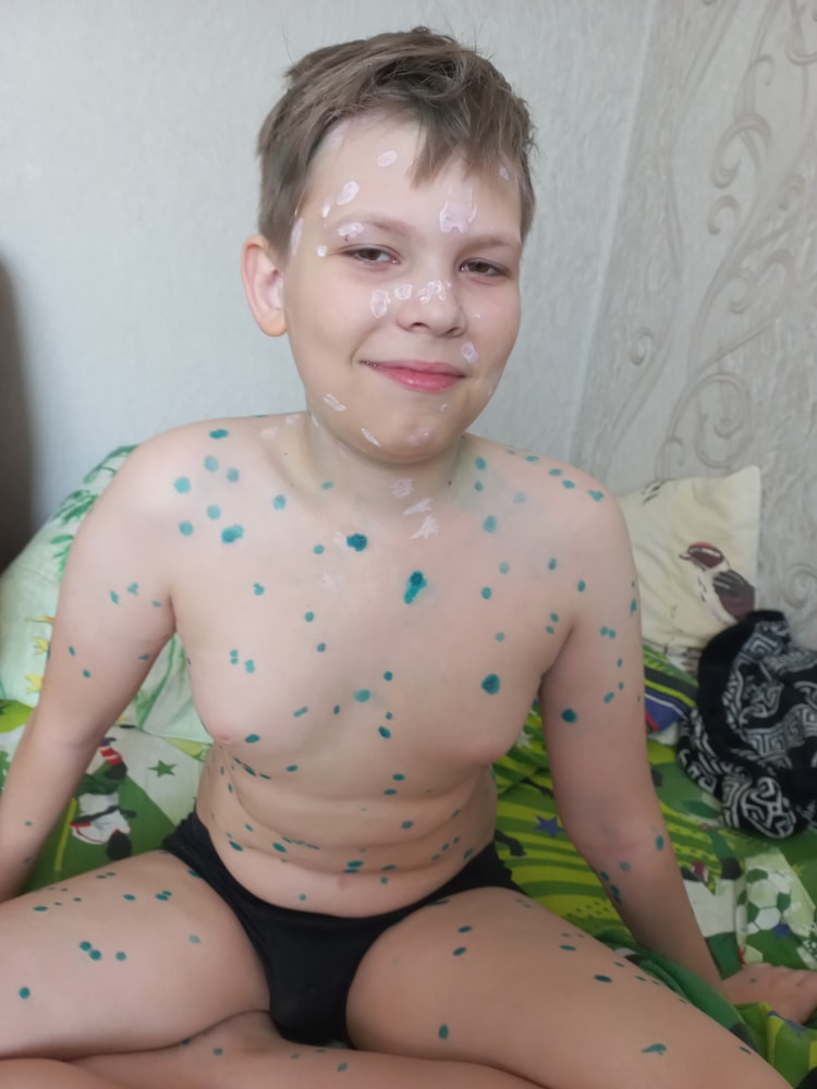 Сынок ЗахарН вот наконец дождались! У Захара ветрянка. В почти 11 лет) На 1 мая сажали картошку. Сказал что устал ,полежу. Мы пришли часа через 3,болят глаза и голова. Температура 37,8. К вечеру появилось несколько прыщиков. Ну а уж с утра 2 го мая как положено.Везде. На минуточку. Мы в классе замыкающие, последние заболевшие выходят 5 мая в школу. Прям чую выпускная фотосессия мимо нас. Как бы мне к выпускному самой не свалится ( не болела я ). Матвей ( старший ) тоже нервничает. Из нас веетрянкой кроме моей мамы не болел никто) Захар говорит что из гепардика скоро в Шрека превратиться пятна появляюся в космической прогрессии. Сегодня 4 день болезни