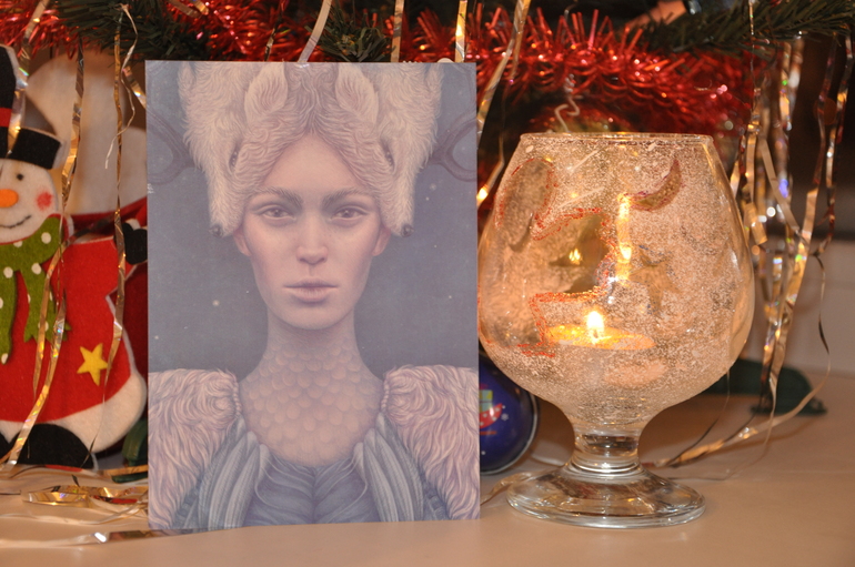А я сразу увидела и волков и чешую)), поэтому немного удивилась что это снежная королева) . Мне нарислвалось в уме что- то скандинавское почему то. В общем красота интригующая)).