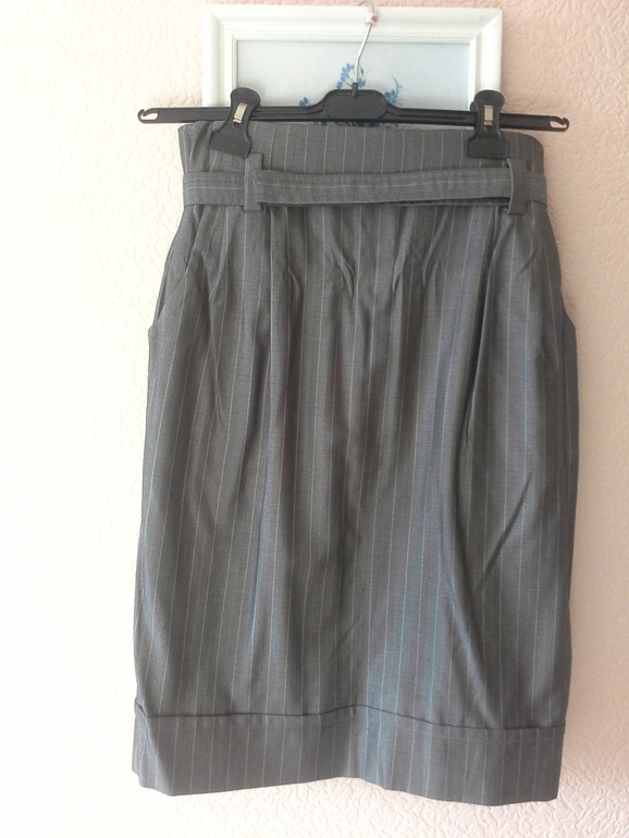 Теплый серый цвет, полоска, очень мягкий блеск, смотрится дорого, собственно, и стоил дорого Юбка с завышенной талией, длина 55 см от пояса, ПОБ 48 см., на 44-46, делает талию