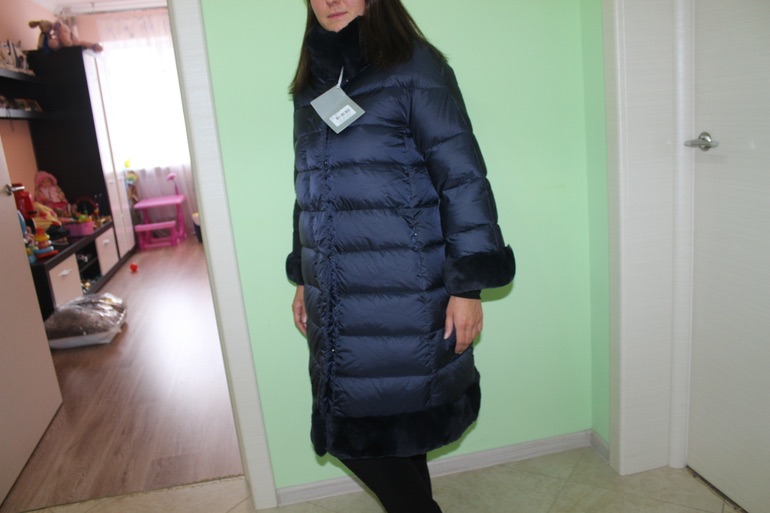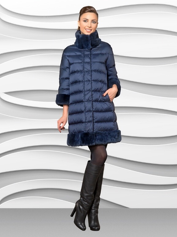 пуховик средней длины трапециевидного силуэта с рукавами 3/4, застегивается на потайную молнию и кнопки. Спереди врезные карманы на молнии. Воротник-стойка, манжеты и подол оформлены мехом рекса. Мех - несъемный.
