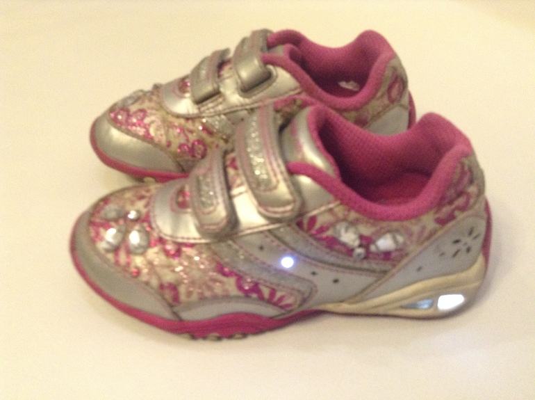Продам кроссовки для девочки фирмы Striderite (США) б/у. Цвет розовый/серебро, размер 8М (это 25,5) 15,5 см по стельке, бусины, люрекс, светятся при ходьбе. Состояние хорошее, огоньки все горят, бусины на месте, не оббиты. Очень нарядные.