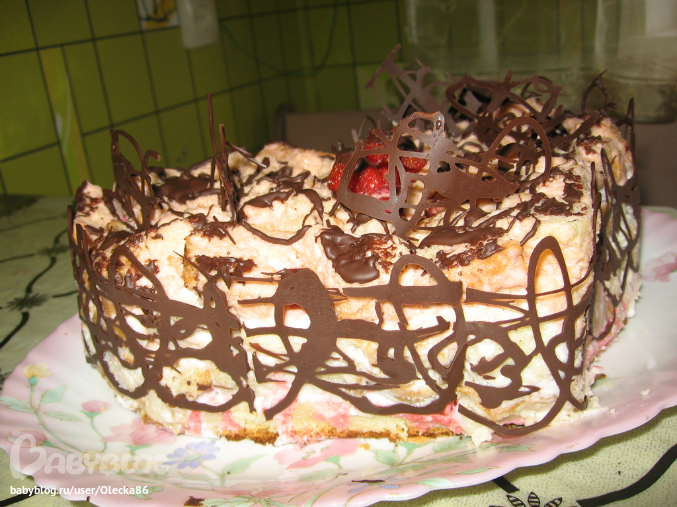 сегодня утром я его сделала. пекла обычный бисквит (с вечера) , крем сметанный+ клубничный сок немного для розового цвета, перкладывала клубникой (была в морозилке). правда 2 проблемки- во-первых переживаю что крем жидковат(не размокнет ли совсем торт?) во-вторых не хватило крема на "обмазать", а времени бежать еще за сметаной не было(( решила попробовать сделать шоколенту кружевную. первый раз. так что косяков куча (оказалось шоколад не особо удобно из кулька из пергаментной бумаги выдавливать). я ленту чуть длинней сделала и остатки повтыкала в торт сверху, потом фото переделаю, тут не видно, он чуть красивей(на этих фото верх наляпан кажется). я же утром дома сфоткала 4 фото, сохранила в черновик, пришла на работу, села писать пост, а тут только 2 фото