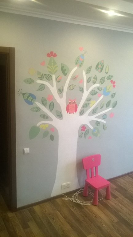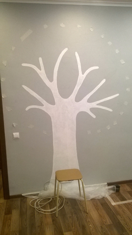 Расскажите подробнее, пожалуйста, протваше дерево, какие краски, стены покрашены или обои, идею дерева сами придумали или нашли какой-нибудь шаблон? Очень красиво получилось!