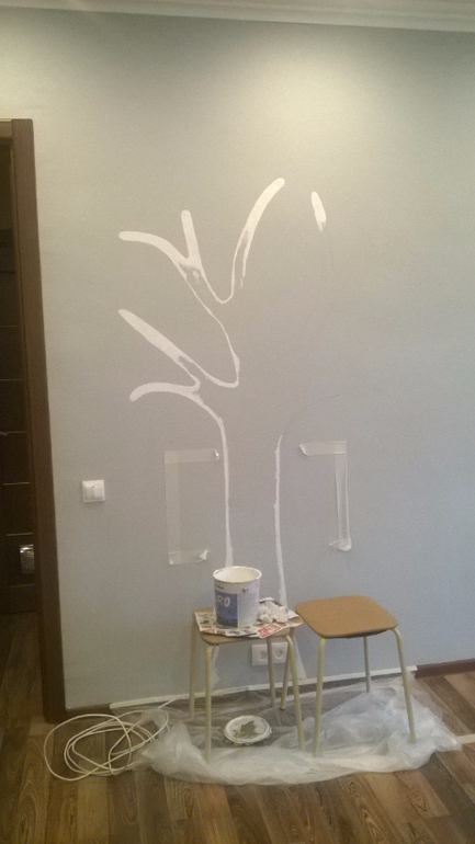 Затем я на листках бумаги нарисовала контуры 4 листиков разных размеров, сердечки, цветочки. Вырезала. На стене малярным скотчем "навела" контуры кроны дерева. Приложила к стене и обвела шаблоны простым карандашом. Так как обои антивандальные и краска моющаяся, то карандаш стирался не ластиком, а тряпкой с Пемоксолью.