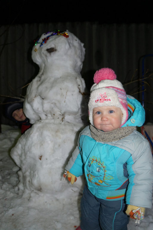 В выходные был снег и мы лепили снеговика