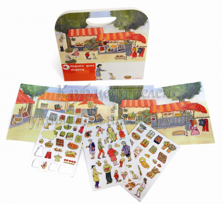Увлекательная магнитная игра для детей в виде продуктового рынка. На магнитной основе в виде продуктового рынка на свежем воздухе ребенок может расставлять покупателей, продукты и прочие аксессуары, придумывая интересные сюжеты и истории.