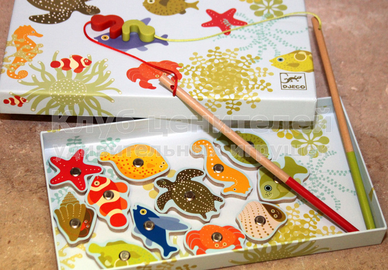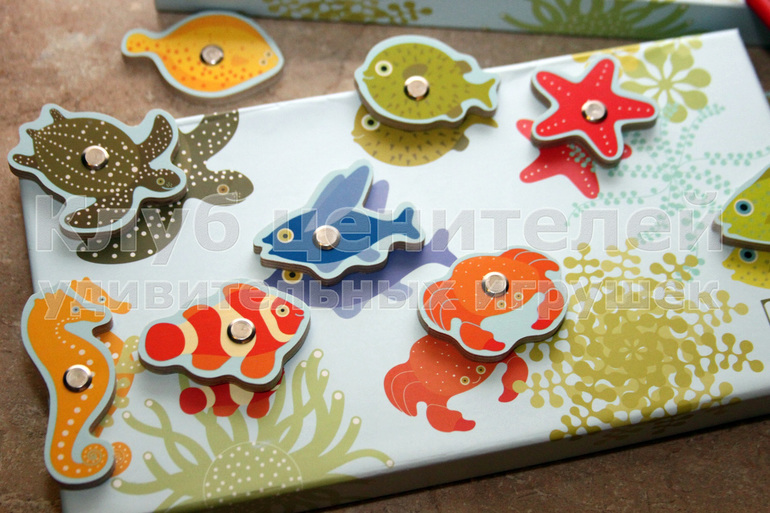 В комплект игры входят 12 ярких обитателей с магнитиками и 2 удочки (каждая удочка также снабжена магнитиком).