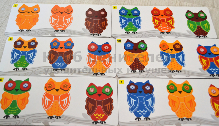 Вариант игры: синюю карточку можно так же положить картинками вверх. Тогда в процессе игры предмет, изображенный на картинке, сопоставляется с таким же на карточке с ответами.