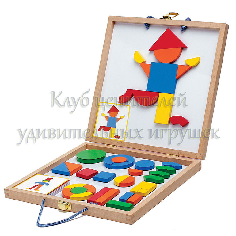 В комплекте 41 деревянная геометрическая фигура на магнитной основе, 6 карточек с примерами.