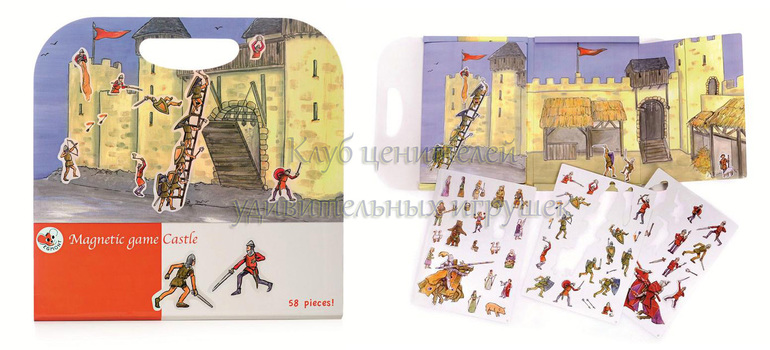 На магнитном фоне в виде средневекового замка с помощью магнитных фигурок пеших рыцарей и всадников на лошадях ребенок воссоздаст исторические битвы. Отважные войны пытаются захватить крепость, со сторожевых башен летят стрелы, войны с обеих сторон сражаются невероятно отважно.