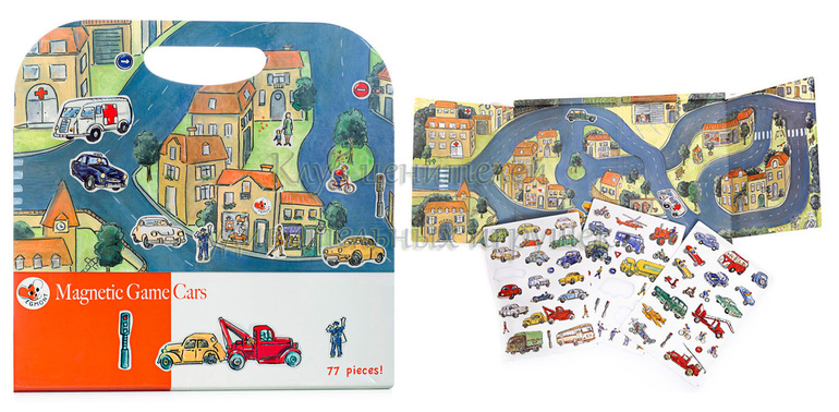 Магнитная игра для мальчиков. Магнитная основа в виде автомобильного шоссе и городского пейзажа. Ребенок с удовольствием будет «возить» машинки, городской транспорт, спецтехнику по дороге. Можно перемещать пешеходов и запускать в небо самолетики. Большое количество магнитных деталей позволяют ребенку играть с машинками снова и снова, придумывая все новые сюжеты.