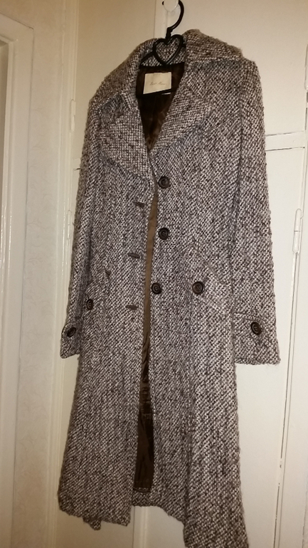 Пальто шерстяное. Цвет серый в рубчик. На девушку ростом 155-165 см, размер 44-46. Состояние хорошее. Покупалось в Южной Корее. На бирке производство Китай.