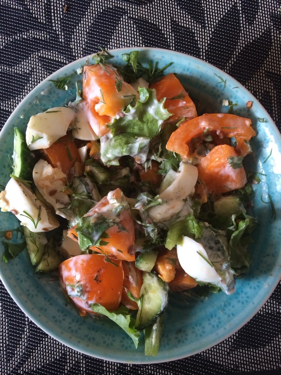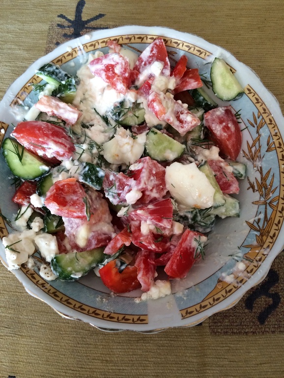И вот такой салат-остатки вчерашнего творога зернистого,огурцы,помидор,красный перец,зелень,соль,перец,яйцо