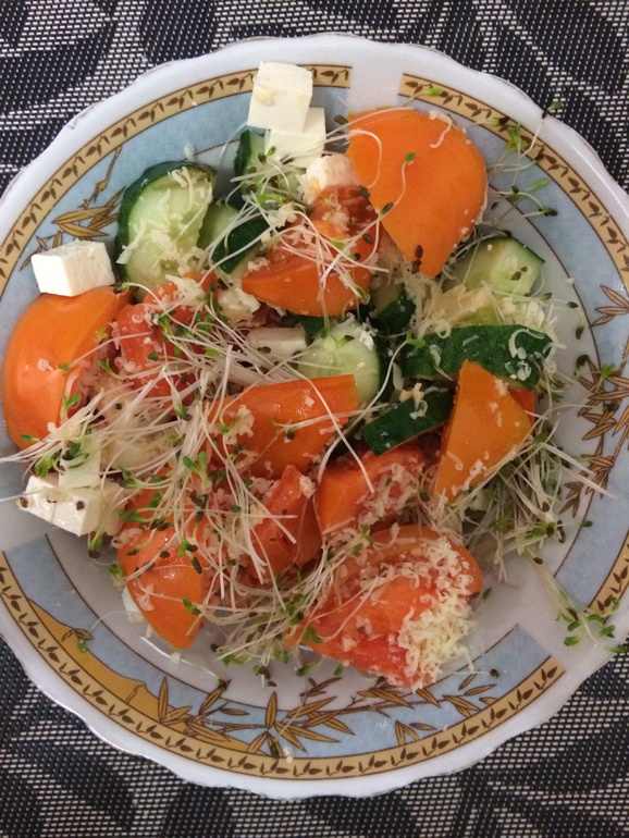 Салат(помидоры,огурцы,ростки люцерны,20 гр сыра грация,100гр 12% брынзы