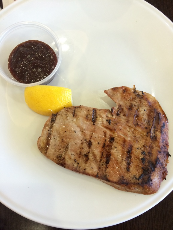 Стейк из тунца на гриле(первый раз тунец в таком виде попробовала),соус барбекю(на фото половину сьела),салат чикен премьер из макдака с уксусом бользамик,каппучино