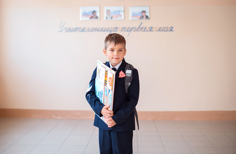 ДенискаНастал этот день! Немного растеряный, даже не знаю, радостный ли мой ребенок. В школу пошли все вчетвером: Матвей, 9 класс уже, Денис, 1 класс, Тася -детский сад, и я!