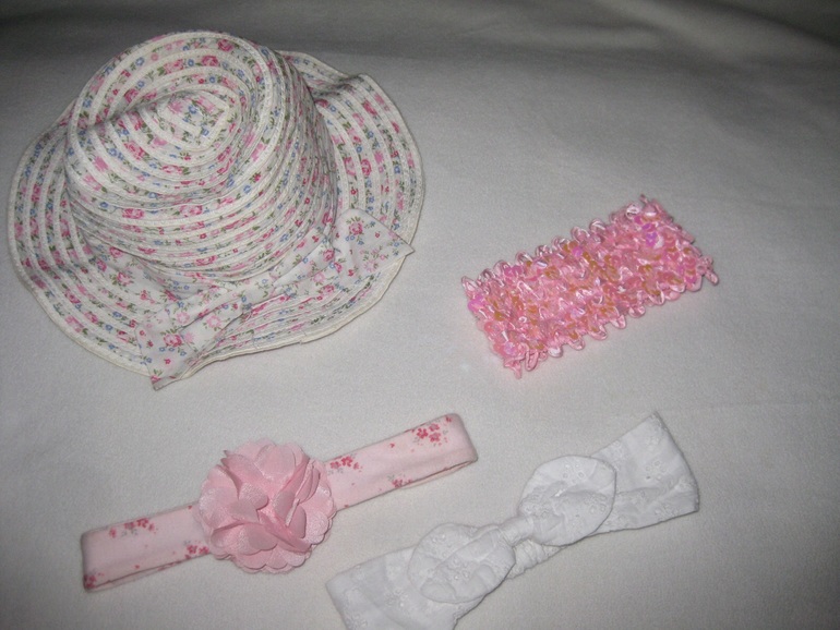 Шляпка и белая повязка H&M, розовая повязка с цветком Next, розовая с пайетками без имени, размер от 6 мес. до года. За все -100 руб.