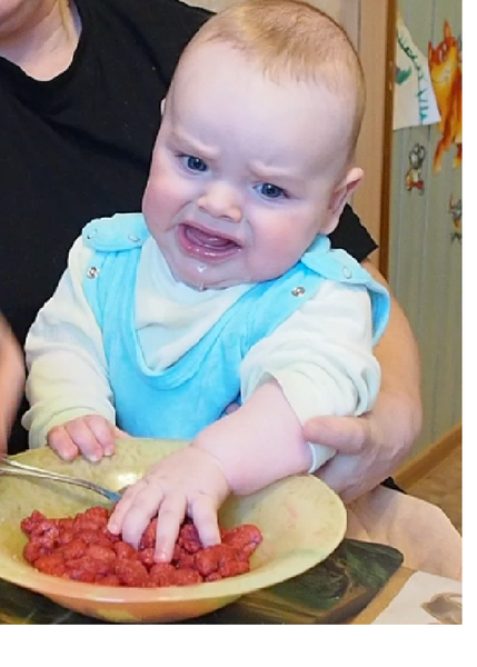 Такой деловой как будто не первый раз сидит за столом и ест, ложку облизывает,но видно не понравилось,кисло. А потом стал руками ее трогать и это вызвало вот такие эмоции: