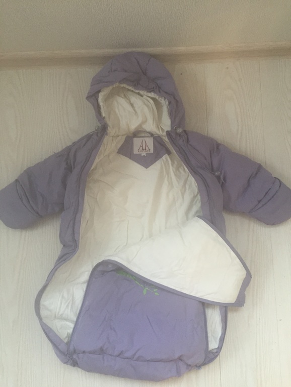 Очень теплый. Приятного фиолетового цвета с чудесной совушкой-аппликацией, унисекс. Б/у после 1 ребенка, в идеале. На молнии, с утяжкой по капюшону,с отворотами на ручках. Носили уже от плюс 5 и ниже в коляске