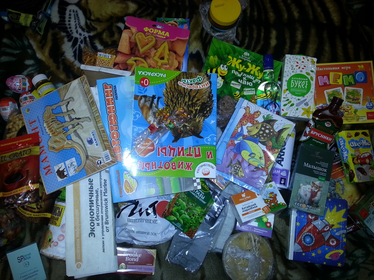 Была и медовуха .Волочка.бальзамы всякие разные.мёд 2 разных вкуса.прополис.Кедровые орешки и шишка с орешками.Чак Чак.мёд для детей Жу Жу.Сладости.отруби для меня и чай для похудения.Всякие развивающие игры и книги.Тёплые носочки и про папу нашего не забыли газета для рыбалки и для бритья наборчик.и много другого смотрите сами