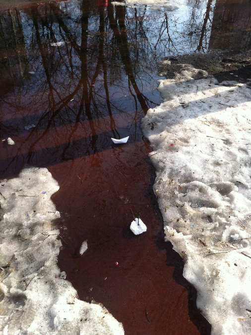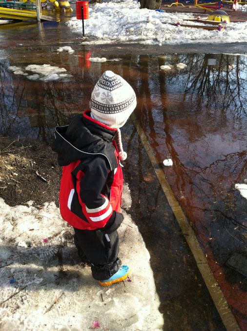 Мы вчера с Вовой нашли замечательную лужу. И после дневного сна мы одели резиновые сапоги и вооруживщись бумажными корабликами сделанными папой который рано пришел с работы пошли их запускать.