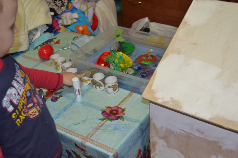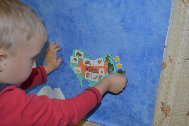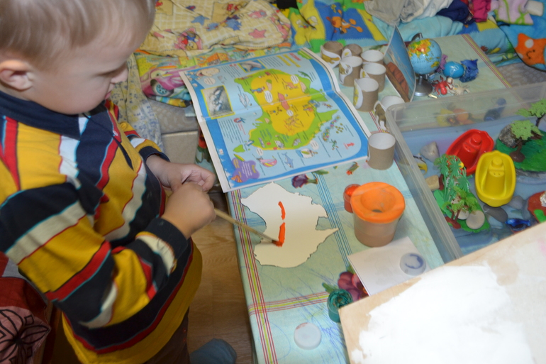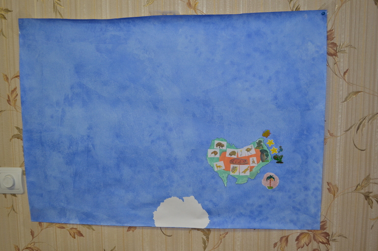 Предложила Мише нарисовать остров и приклеить на карту , не захотел, устал уже... Тогда я сделала сама и сказала, что теперь у меня на карте есть свой остров, и когда он захочет сможет нарисовать и приклеить свой)