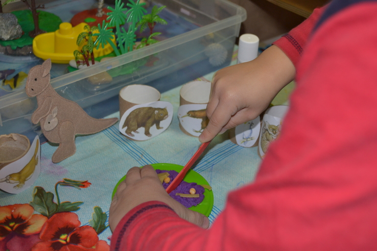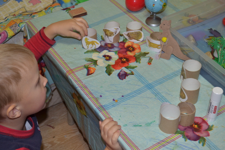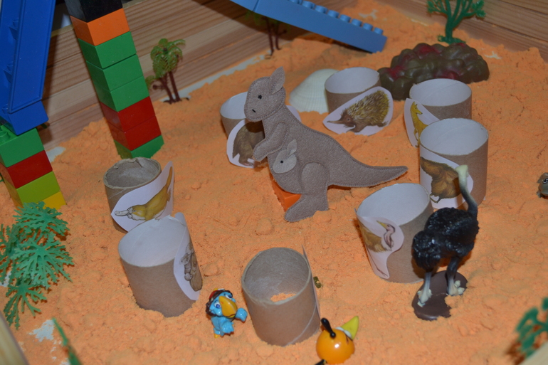 В среду у нас было Лего и пока Миша с папой были на занятиях я смогла все приготовить. Фигурок животных Австралии у нас не оказалось в достаточном количестве, поэтому сделала сама - разрезала рулончики от т/бумаги на 2 половинки и приклеила картинки, спрятала в комнате как и предложила Оксана...