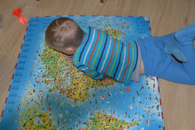 Он весь в Антарктиде и Австралии))) Подходит к карте, которая висела на стене над столом и говорит - Мам я хочу посмотреть Антарктиду... Говорю - давай сниму карту...