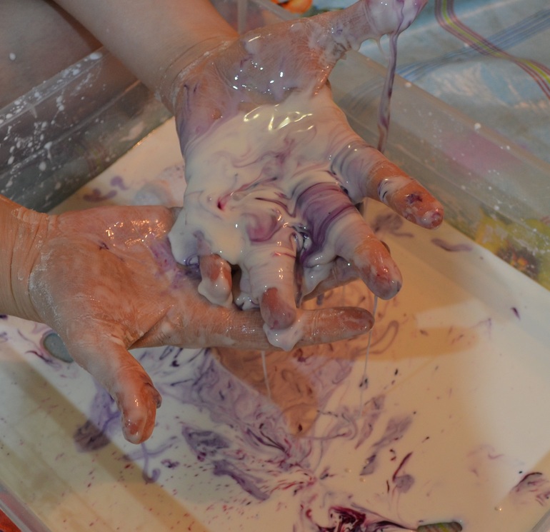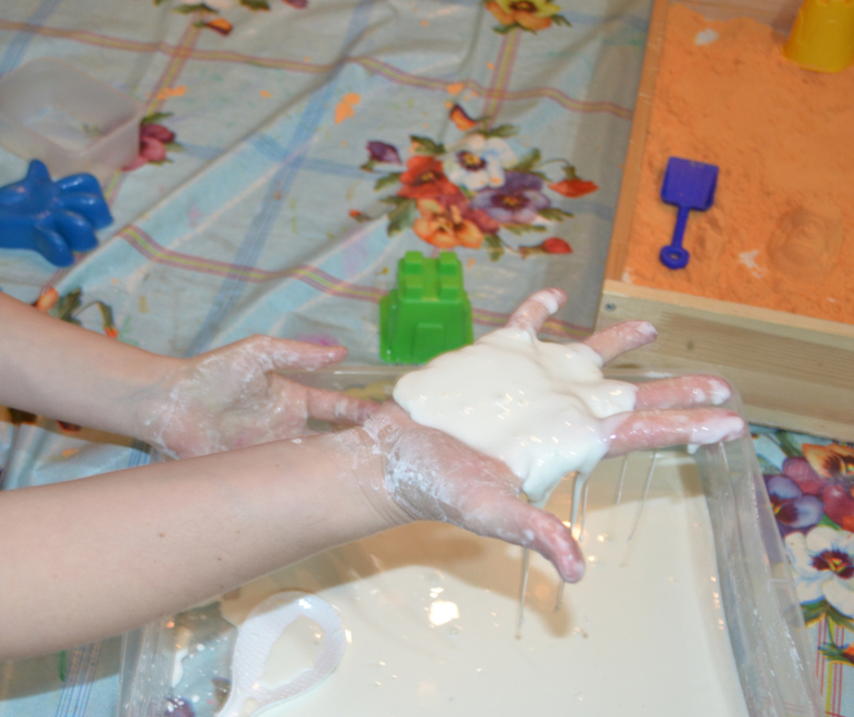Суууупер! Я в восторге!!! Миша обожает сенсорные коробочки, крупы, песок, даже играл снегом самодельным крахмал+пена, поэтому я была уверена что он будет рад поиграть, но я ошиблась. Он никогда не любил пачкаться, пальчиковыми красками не рисовал, в море из желе руками не плавал. Замешивали вместе и у уже на этой стадии он почему то не захотел даже потрогать. Кстати, НИКТО из моих мужчин не проникся, как я не приставала к ним и не пищала от восторга... Дала Мише щипцы, ложку, думала хоть так поиграет, нееет. Принес песок и стал играть им