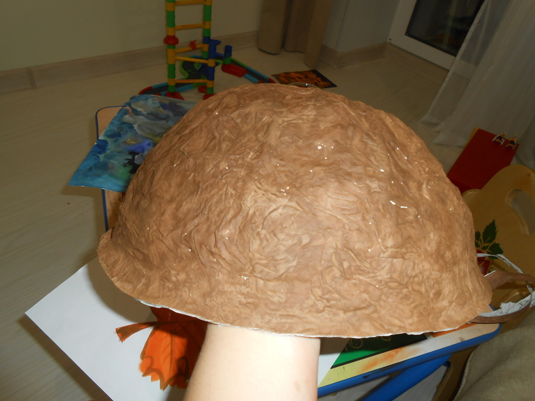 Родителям дали задание - смастерить шапочку гриба, только не мухомора. А сами для примера в вестибюле группы положили вьетнамскую шапку мухомора на ножке)))) Ну смешно же. Я подумала, и решила не травмировать детскую психику коричневой вьетнамской шляпой, поэтому совместно с ребенком сделали шляпку боровичка