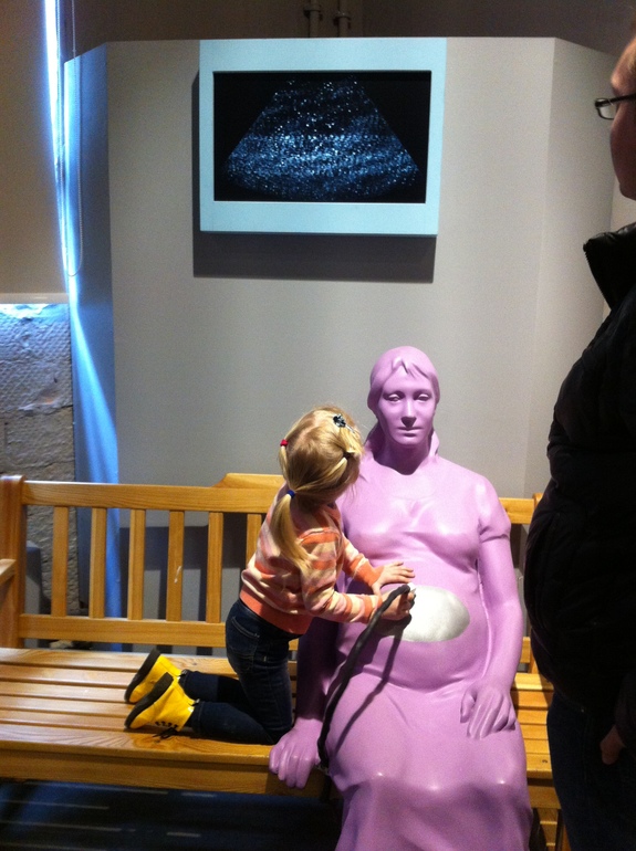 Есть там "центрифуга". Туда помещается взрослый в позе эмбриона и работники музея раскачивают туда-сюда, показывая тем самым, что ребенок до 32 недели в животе принимает любое положение. Муж полез туда, а я не рискнула ))) Его хватило на два переворота, мой вестибулярный аппарат такого не выдержал бы )))) Накидка-жилет на плечи для наглядного примера - как тяжело приходится беременным ) муж надел и сказал - что легко )))