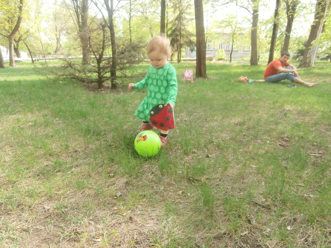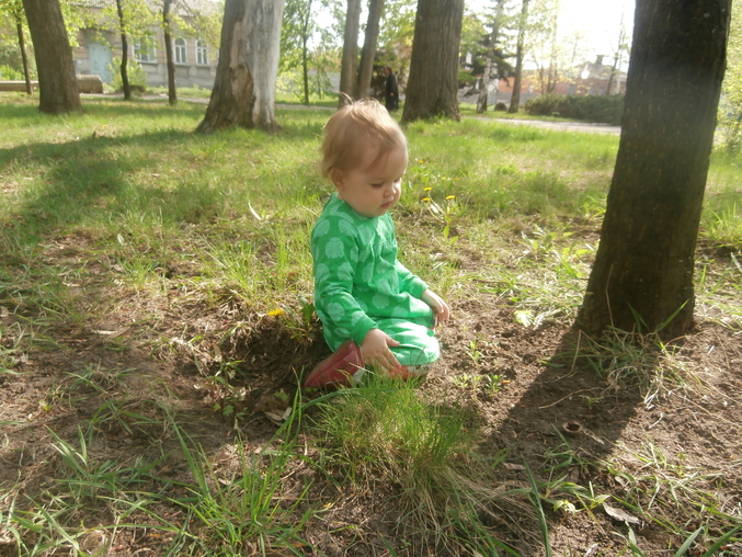 Первая вылазка в песочницу))) Папа показывае, как играть песочком...