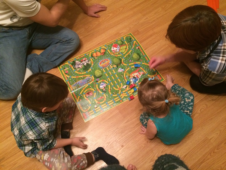 Ходилки. Это наша безусловная самая сильная любовь уже больше года. Вот такая с тачками "Гонки на выживание" любимая, потому что там вместо фишек грузовички ездят. Бесконечное количество раз может сыграть. Считаем на английском для разнообразия.