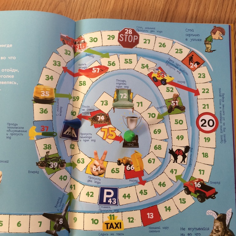 Здесь можно ускакать и на 11, 20, 30 шагов вперед, и слететь на начало игры или в предыдущий круг на спирали, и куча прочих подстав, в общем результат почти непредсказуем! Но не в нашем случае)) тиме и здесь везет, я не выиграла ни разу. Однажды он выиграл за четыре хода, так совпали спец фишки. Чума)))