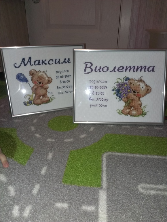 Вышивки были готовы давно, еще до рождения Виолетты, только данные вышивались уже после рождения:) А мастерицу нашла здесь на ББ, Валентина просто Умничка! Работа прекрасная! Только когда будете заказывать подумайте о рамке сразу, а то я размер дала навскидку и полгода рамки подбирала))