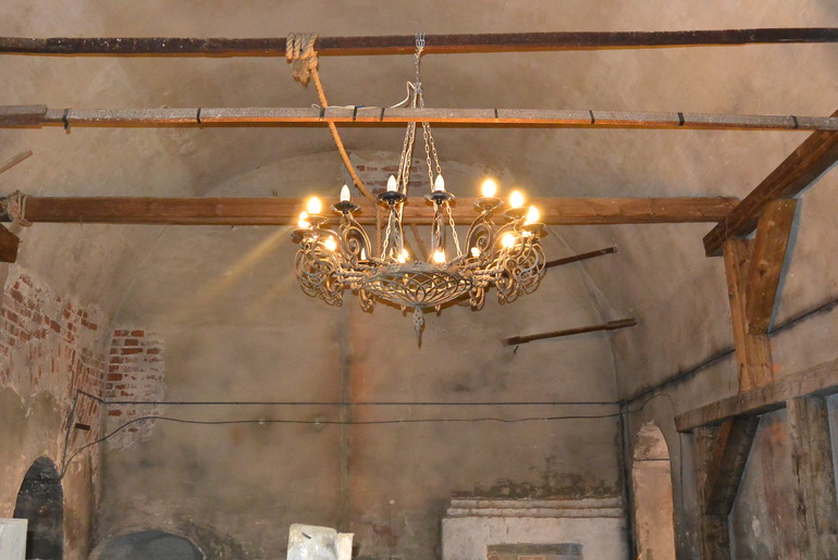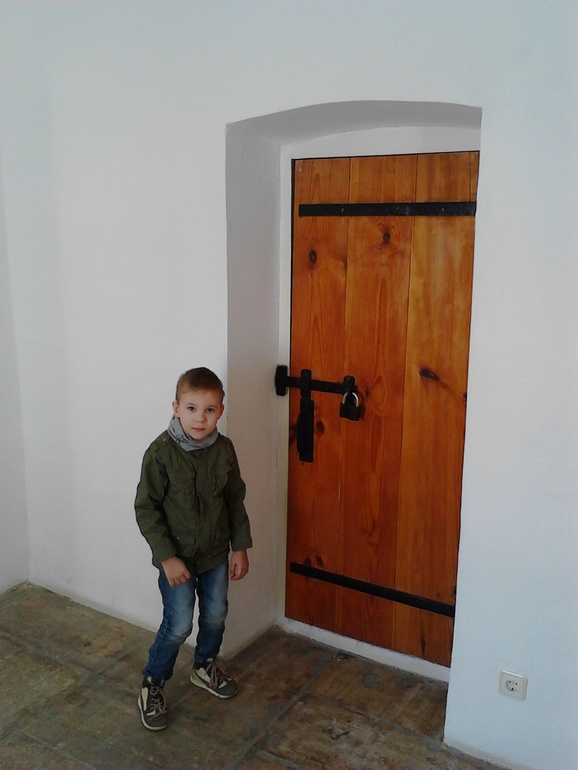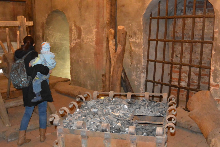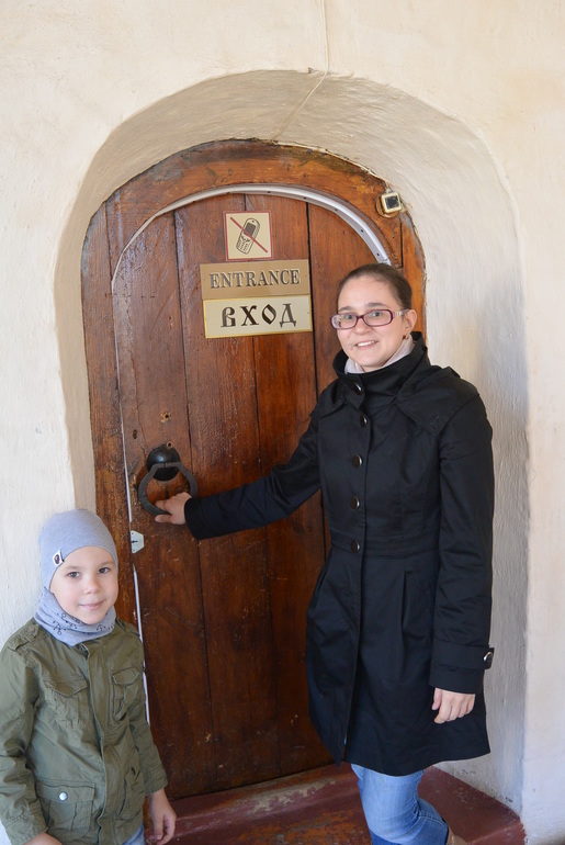 Со стены попадаем в башню. Не знаю как правильно ее назвать. Плохо, что мы без экскурсовода. Круглое-это, очевидно, устройство типа катапульты. В этом помещении практически темно, тускло освещает люстра (на фото просто вспышка осветила все),кажется, что с тех самых пор ничего не изменилось.