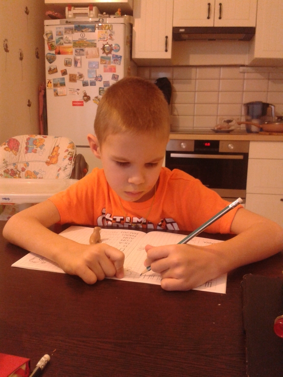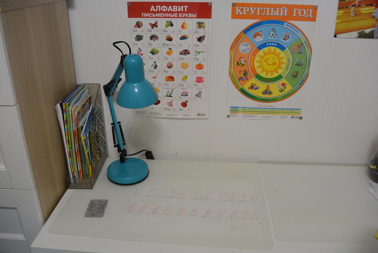 Вот такое сейчас у Макара рабочее место.На столе под пленкой еще лежит числовая прямая самодельная, которая помогает нам в математике. Надо бы сделать до ста.