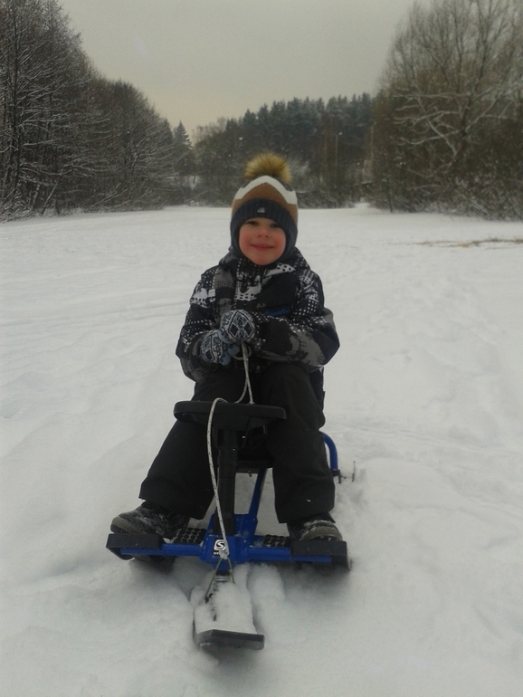 Вот Макар на Клязьме сидит)) Ну посмотрите какая красота в пяти минутах от дома. Санки зимой очень выручают. Это единственные, где он нормально сидит, т.к. есть за что держаться. Зимой Макару ходить тяжело из-за снега. Если почищено, то хорошо, а если месиво, то это ооочень тяжело и долго.