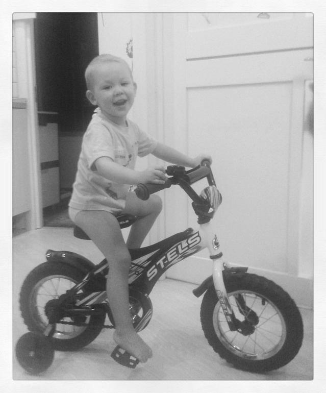 Ванюхе крестные подарили велосипед. И вроде до педалей достает, а крутить не получается, педали тяжелые. Отложила этот велик на следующий год и решила купить ему самый обычный трехколесный. Так он дома на нем как на беговеле бегает, а педали все равно не крутит, не знаю как научить. Макар поехал на трехколесном в 2 г8мес.