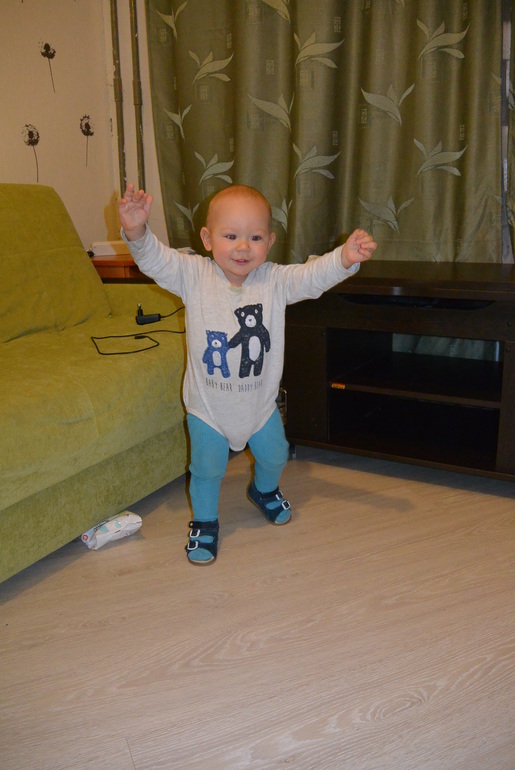Стал заметно больше ходить. Чудонько мое. Так сладко топочет, расставляя ноги широко и часто еще и руки вперед или вверх делает))) за воздух держится))