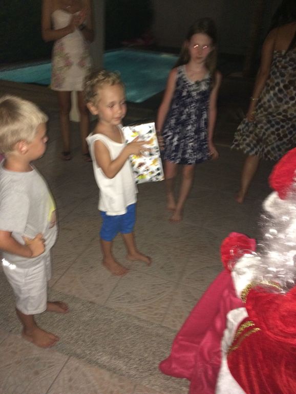 Так ...что еще...да.! Ну и перед долгожданными 12:00 по тайскому времени приходит ...кто?! Правильно Дед Мороз. Тут с ними не трудно за неделю до праздника начинается спам рассылка, реклама дедов морозов и снегурочек. Их не много , но есть. Так что дитятко не останется без волшебства. Стоит от 100 долларов до 200. Мы ходили праздновать к друзьям, а у тех был и костюм деда мороза и дружище, который вызвался во все это одеться))) правда за несколько часов до часа "хэ" выяснилось, что нет мешка доя подарков))) я побежал в Теско и купил флисовый красный плед за 10$! И буквально вбежал с ним за пазухой домой и сразу в тубзик ( Мишаня ж не должен видеть) где протыкая себе все пальца сшил из него симпатичный мешочек)))) в общем дети поиграли в кучу конкурсов, отгадали заветное слово и после этого к нам пришел Дедушка Мороз. Тут традиционно стихи, песни, хоровод, подарки от которого детишки попискивали от счастья! И черепашек Ниндзя и глазированные сырки Мигельчик получил, как и писал в письме!