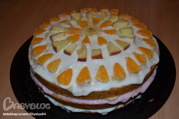 Я не большой любитель бисквитов в отличие от мужа. Зато Сметанник в нашей семье идёт на УРА! Поэтому и на Новый год делала тортик на основе Сметанника http://www.babyblog.ru/user/Olyalya84/3035153 . Просто разрезала его на коржи и пропитала сливочно-твородным кремом.