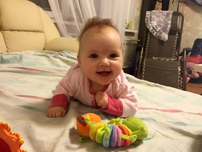 + тянуться к предмету; а также хватать лежащие игрушки и бутылочку, тянется и хватает только любимую гусеницу и погремушку-цветок, остальное как то не особо интересует