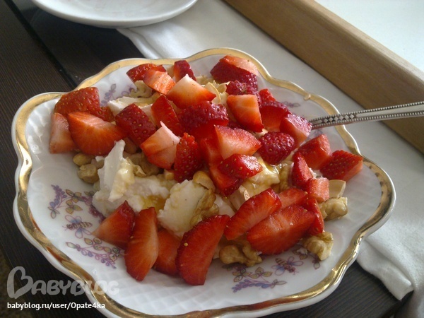 ну и напоследок мой завтрак - домашний творог, мед, орехи, клубника))) сплошные аллергены. но так вкусно)))