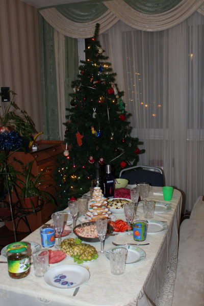 так вот, сели мы за стол часиков в 9 вечера, когда наши мужья утащили оливье и слопали его. в итоге наш стол был без традиционного салата) зато с ёлочкой!