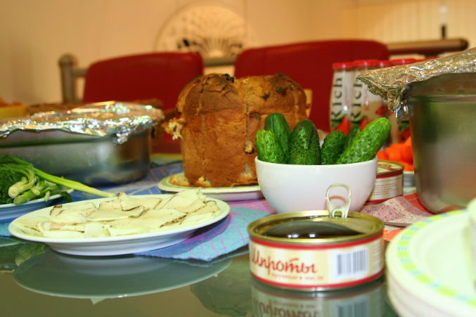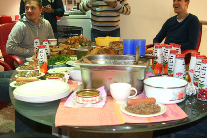 ах да! стол же накрыли! сало, огурчики малосольные, шпроты, злебушек, яйца вареные в специальной посудине, гречка и сосиски. ну и еще много чего. но тоже весело))